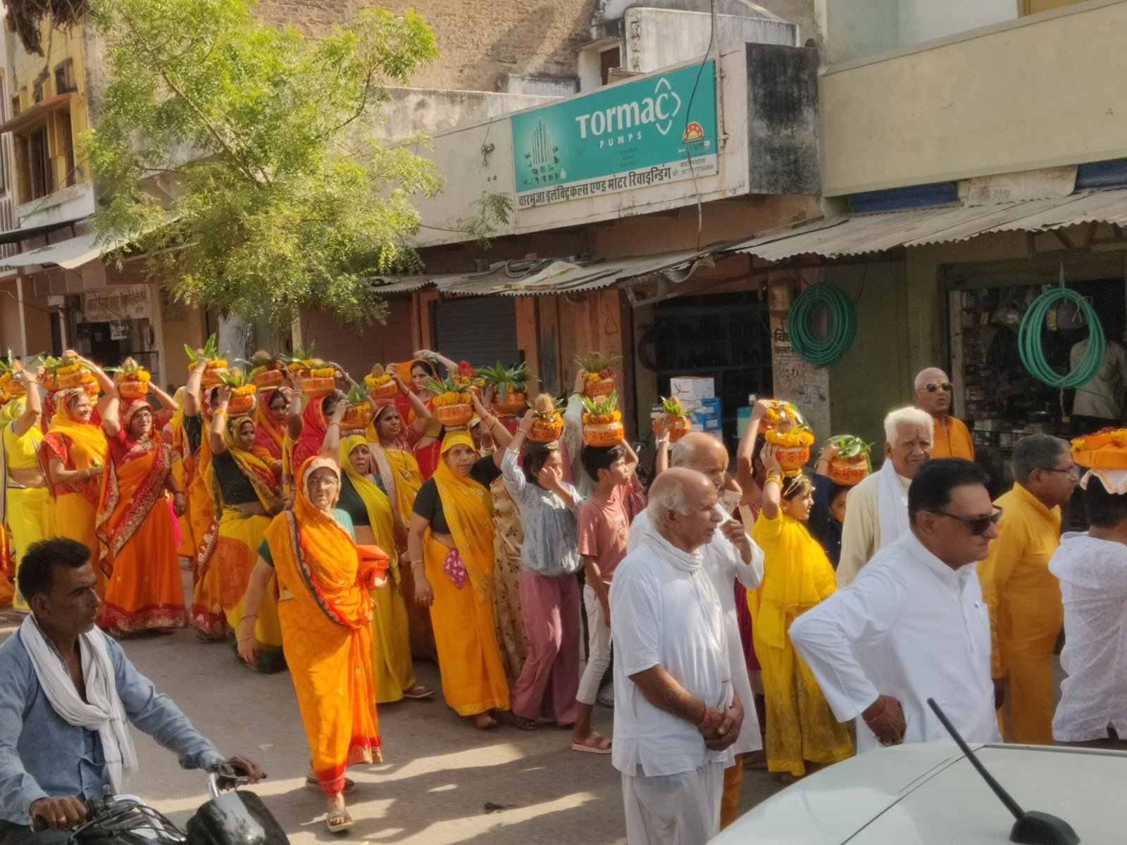 सवाईपुर ( सांवर वैष्णव ):- क्षेत्र के बड़लियास कस्बे में गायत्री परिवार ट्रस्ट शांति कुंज हरिद्वार के द्वारा पांच दिवसीय प्रज्ञा पुराण कथा व नौ कुण्डीय गायत्री महायज्ञ की शुरुआत आज शुक्रवार को कलश यात्रा के साथ हुई, जिसमें महिलाएं पीले वस्त्र पहनकर कलश यात्रा में शामिल हुई । टोली नायक सुरेश चंद्र शर्मा ने बताया कि बड़लियास कस्बे में बालाजी की बगीची में वेदमाता गायत्री परिवार ट्रस्ट शांति कुंज हरिद्वार के द्वारा प्रज्ञा पुराण कथा, नौ कुण्डीय गायत्री महायज्ञ एवं संस्कार महोत्सव का आयोजन आज शुक्रवार को कलश यात्रा के साथ शुरू हुई, कलश यात्रा प्रातः 9:15 बजे बालाजी की बगीची से प्रारंभ हुई, सहयोगी विद्यासागर, नरेश कुमार, दिनेश राम के द्वारा वैदिक मंत्रोच्चार के साथ पूजा अर्चना की गई, 71 महिलाएं सिर पर कलश लिए पीले वस्त्र पहनकर शामिल हुई, कलश यात्रा चमन चौराहा, मेन बस स्टैंड, मैन बाजार, बड़ा मंदिर सहित गांव के विभिन्न मार्गो से होते हुए गुजरी, कलश यात्रा का जगह-जगह ग्रामीणों ने पुष्प वर्षा कर स्वागत किया, अंत में कलश यात्रा पुनः बालाजी की बगीची पर पहुंची । इस दौरान पूर्व प्रधान विजय सिंह, प्रहलाद राय काबरा, ओम प्रकाश पोरवाल, सत्यनारायण काबरा, ओम काबरा, जगदीश पोरवाल, पीयूष त्रिवेदी, भंवरलाल सोनी, सांवरमल चतुर्वेदी आदि कई मौजूद रहे । वही दोपहर 3 से सायं 6बजे तक प्रज्ञा पुराण कथा, सायं 8:30 बजे कार्यकर्ता गोष्ठी हुई । 19 से 21 अप्रैल तक प्रातः 6 बजे से 7 बजे तक प्रज्ञा योग व्यायाम, प्राणायाम योग, रोग व्याधी निवारण परामर्श व प्रातः 8 से 9:30 तक गायत्री महायज्ञ, दोपहर 12 से 2 बजे तक प्रज्ञा पुराण कथा एवं सायं 7:30 बजे कार्यकर्ता गोष्ठी का आयोजन होगा । 21 अप्रैल को सायं 5:30 बजे विशाल दीप महायज्ञ । और 22 अप्रैल को प्रातः 6 से 7 बजे तक प्रज्ञा योग व्यायाम, प्रातः 8 से 10 बजे तक पूर्णाहुति तथा प्रातः 10:30 बजे महायज्ञ प्रसादी का वितरण किया जाएगा ।।
