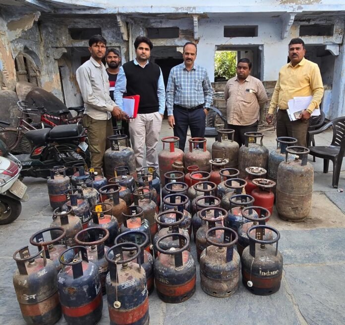 जांच के दौरान नृसिंह गली, भैरू चौराहा स्थित चिंटू साइकिल स्टोर पर अवैध रूप से गैस सिलेंडरों का भंडारण और बिक्री पाई गई। दुकान संचालक चंद्रेश गर्ग एक सघन रिहायशी क्षेत्र में स्थित पुराने मकान का उपयोग गैस भंडारण स्थल के रूप में कर रहा था।