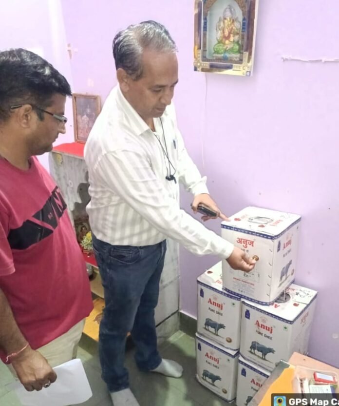 बूंदी- स्मार्ट हलचल|खाद्य सुरक्षा आयुक्तालय द्वारा डाॅ0 टी शुभमंगला के निर्देशन में आगामी त्योहार को देखते हुए जिला कलक्टर बून्दी के निर्देशानुसार मुख्य चिकित्सा एवं स्वास्थ्य अधिकारी डाॅ0 ओ0 पी0 सामर ने बताया कि त्यौहारी सीजन को देखते हुए दिनांक 04/10/2025 से निरन्तर शुद्ध आहार मिलावट पर वार अभियान चलाया जा रहा है। अभियान के दौरान आज दिनांक 06/10/2025 को दो प्रतिष्ठानों का निरीक्षण किया गया। निरीक्षण के दौरान 75 किलो0 घी सीज किया गया तथा साथ ही दो नमूने घी के व एक मावा का नमूना वास्ते जांच हेतु लिया गया। जांच रिपोर्ट प्राप्त होने के पश्चात नियमानुसार कार्यवाही की जाऐगी। साथ ही जिले के सभी खाद्य कारोबारकर्ताओं को निर्देश दिए गये कि आमजन को शुद्ध खाद्य पदार्थ का विक्रय करने के आदेश दिए तथा अशुद्ध खाद्य पदार्थों का विक्रय नहीं करे। ताकि आमजन को शुद्ध खाद्य पदार्थ मिल सके।