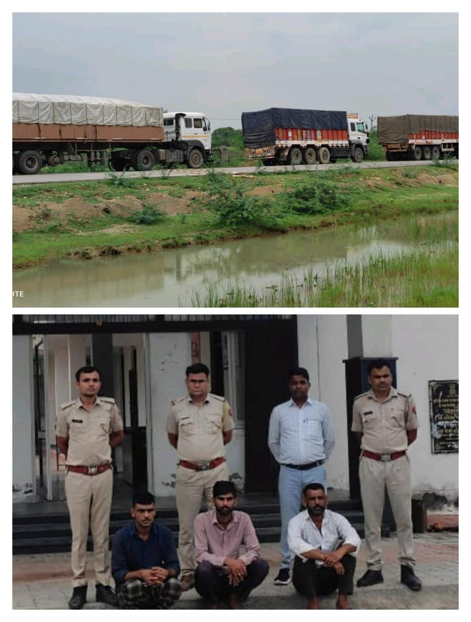 रोपां 23 अगस्त । पारोली थाना क्षेत्र के दांतड़ा बिशनिया रोड़ पर बुती के पास गुरुवार देर रात्रि को पारोली पुलिस ने कार्यवाही करते हुए अवैध बजरी से भरे 3 ट्रेलर पकड़े साथ ही तीन बजरी माफियाओं को गिरफ्तार किया । पारोली थाना प्रभारी भंवरलाल मीणा ने बताया कि डीएसटी की सूचना पर पारोली पुलिस ने गश्त के दौरान दांतड़ा बिशनिया रोड़ बुती के पास कार्यवाही करते हुए अवैध बजरी से भरे 3 ट्रेलर को पकड़कर थाने में लाकर खड़ा किया तथा रतीलाल गुर्जर, राजकुमार जाट और सुभाष जाट को गिरफ्तार किया और मुकदमा दर्ज कर जांच शुरू की गई। वहीं इस कार्यवाही से बजरी माफियाओ में हड़कंप मच गया। इस महीने पारोली पुलिस ने अवैध बजरी के खिलाफ दूसरी बड़ी कार्यवाही की ।