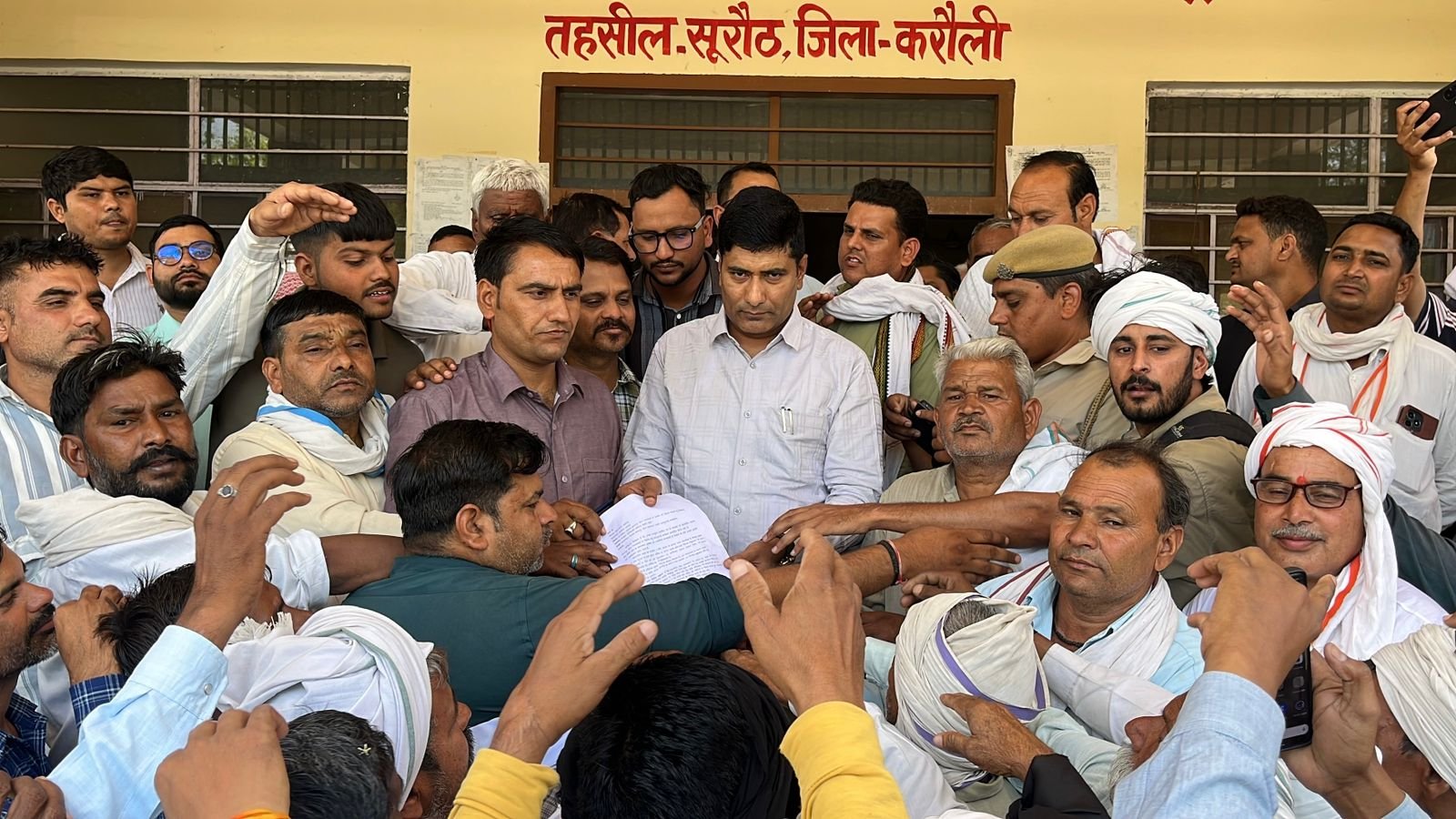 सूरौठ। स्मार्ट हलचल|सरकार की ओर से प्रस्तावित ब्यावर भरतपुर ग्रीनफील्ड एक्सप्रेस-वे के लिए भूमि अवाप्ति हेतु गुरुवार को सूरौठ तहसील कार्यालय में आयोजित हुए जनसुनवाई कार्यक्रम में क्षेत्र के किसानों ने काफी हंगामा किया। ब्यावर भरतपुर ग्रीनफील्ड एक्सप्रेस वे को निरस्त करने की मांग को लेकर करीब 10 किसान तहसील परिसर में स्थित पेयजल टंकी पर चढ़ गए। हालांकि हिंडौन एसडीएम हेमराज गुर्जर की समझाइश पर 5 मिनट बाद ही किसान टंकी से नीचे उतर आए। इसके बाद किसानों ने तहसील कार्यालय में सरकार के खिलाफ नारेबाजी कर विरोध प्रदर्शन किया तथा एसडीएम को ज्ञापन सौंप कर आपत्ति जताई।