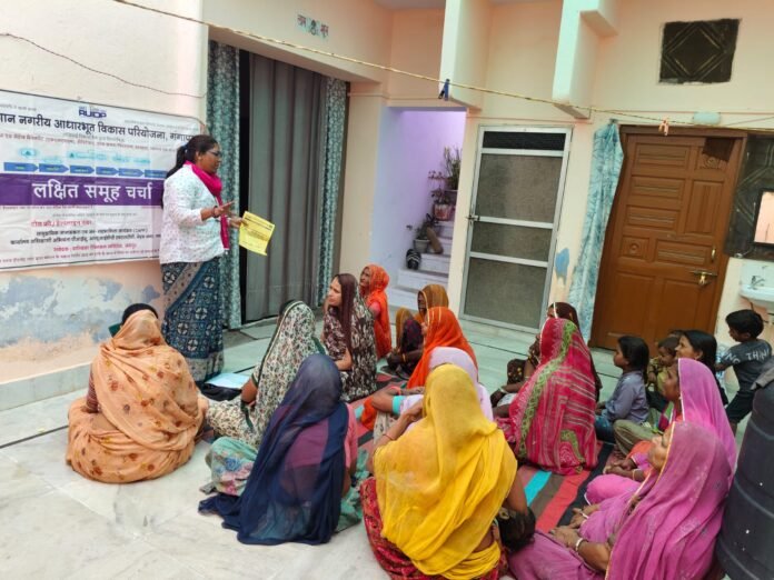 गंगापुर,स्मार्ट हलचल|राजस्थान नगरीय आधारभूत विकास परियोजना (आरयूआईडीपी) की सामुदायिक जागरूकता एवं जन सहभागिता इकाई द्वारा बलाई मोहल्ला, वार्ड संख्या 2 में महिलाओं के लिए जागरूकता कार्यक्रम आयोजित किया गया। कार्यक्रम में महिलाओं को स्वच्छता, साफ-सफाई और स्वास्थ्य संबंधी महत्वपूर्ण जानकारियां दी गईं।