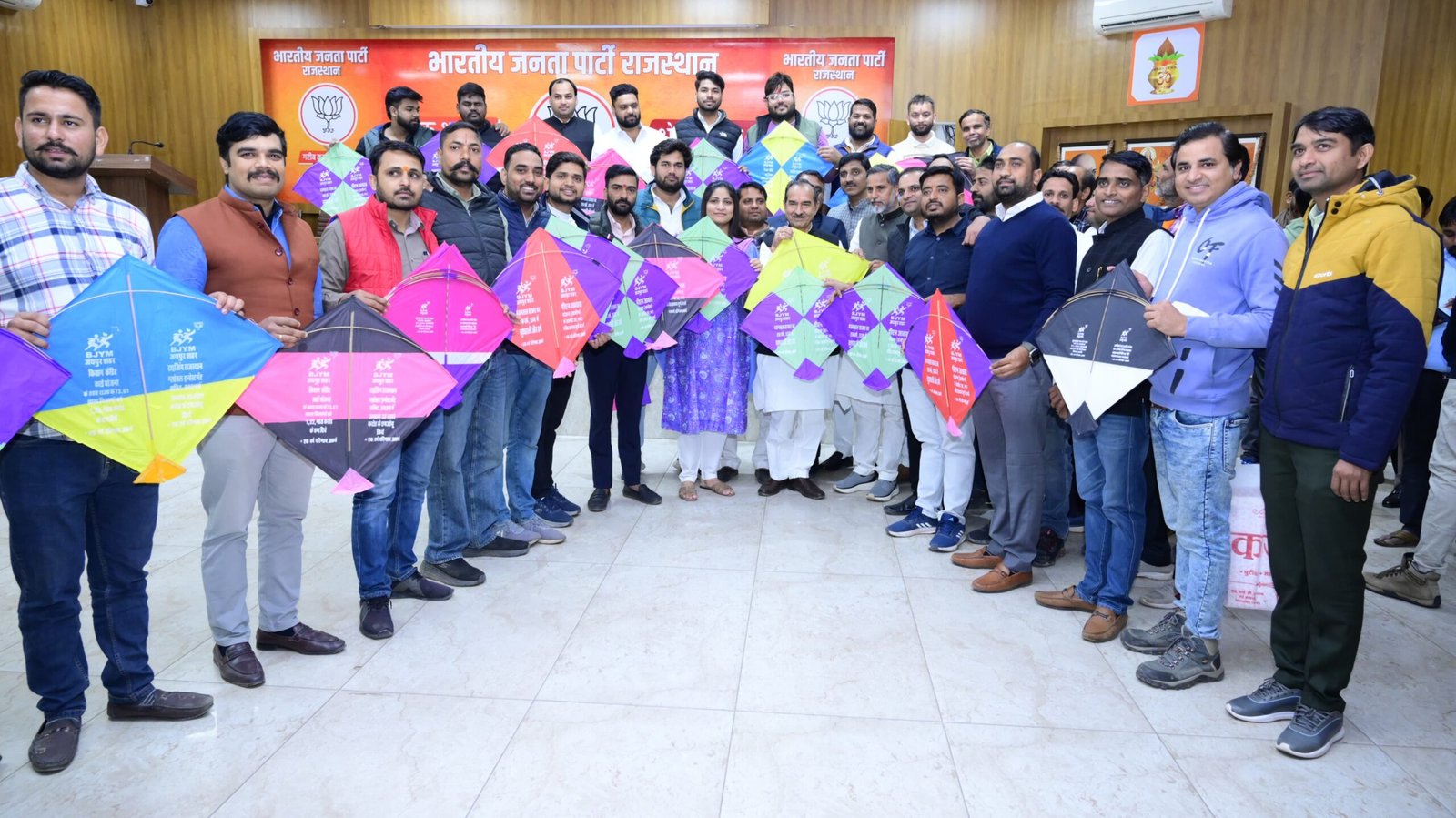 जयपुर शहर भाजयुमो जिलाध्यक्ष सुरेंद्र सिंह पुरूवंशी ने बताया कि राजधानी जयपुर में पतंग महोत्सव युवाओं की पहली पसंद है, ऐसे में युवाओं के बीच भाजपा सरकार की योजनाओं को ले जाने के लिए युवा मोर्चा जयपुर शहर की ओर से पतंग पर भाजपा की योजनाएं अंकित कर उनका वितरण किया जा रहा है। शुक्रवार को भाजपा प्रदेश कार्यालय में प्रदेश अध्यक्ष मदन राठौड़ ने पतंगों का निरीक्षण किया और युवा मोर्चा के कार्य की प्रशंसा की।