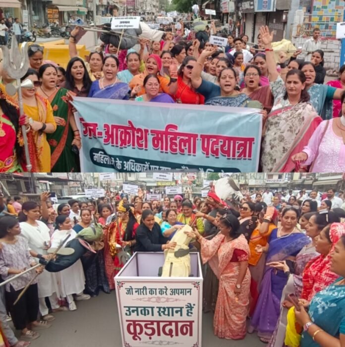 सूचना केंद्र स्थित बजरंगी चौराहे पर प्रदर्शन के दौरान एक महिला ने मां दुर्गा का रूप धारण कर त्रिशूल से पुतलों का प्रतीकात्मक संहार किया। इसके बाद आक्रोशित महिलाओं ने पुतलों को कूड़ेदान में डालते हुए संदेश दिया कि महिला विरोधी सोच रखने वालों के लिए समाज में कोई स्थान नहीं है।