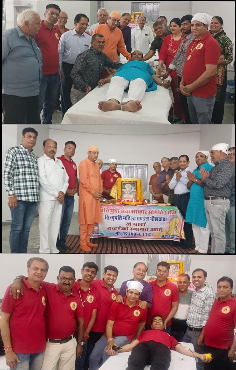 भीलवाड़ा। सिंधी समाज के आराध्य देव भगवान श्री झूलेलाल साहिब के जन्मोत्सव चेटीचण्ड महोत्सव के उपलक्ष में भीलवाड़ा के सकल सिंधी समाज ने सेवा और मानवता की मिसाल पेश करते हुए विशाल रक्तदान शिविर का आयोजन किया। सिन्धुपति युवा सेवा संस्कार समिति (रजि.) व सिन्धुपति महिला मण्डल के तत्वावधान में आयोजित इस शिविर में समाज के युवाओं, महिलाओं और वरिष्ठजनों ने उत्साहपूर्वक भाग लेते हुए कुल 172 यूनिट रक्तदान कर मानव सेवा का अद्भुत उदाहरण प्रस्तुत किया।
