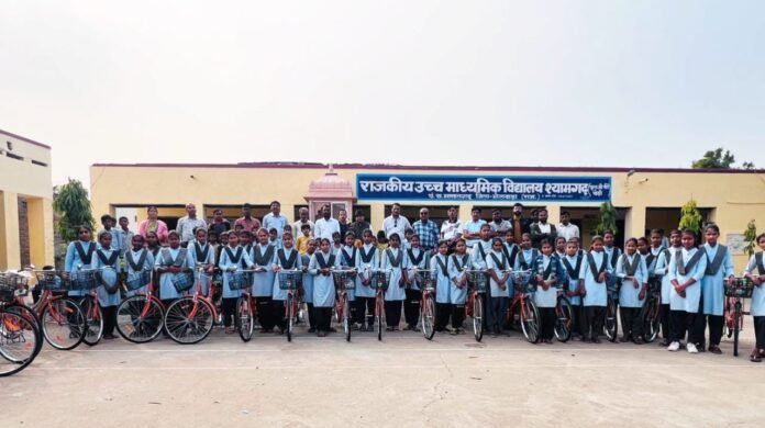 लाडपुरा । स्मार्ट हलचल ।राजकीय उच्च माध्यमिक विद्यालय श्यामगढ़ में बुधवार को कक्षा 9 की 36 छात्रों को साइकिल वितरित की गई। यह कार्यक्रम निःशुल्क साइकिल वितरण योजना के अंतर्गत आयोजित किया गया। जिसका उद्देश्य छात्राओं को शिक्षा के प्रति प्रोत्साहित करना है। साइकिल वितरण के दौरान छात्रों को शिक्षा के महत्व और आगे बढ़ने के लिए प्रेरित किया गया। साइकिल वितरण समारोह में पंचायत समिति सदस्य सत्यनारायण मेवाड़ा, सरपंच प्रतिनिधि सूरजमल गुर्जर, एसएमसी अध्यक्ष भोजराज मीणा, विद्यालय के प्रधानाचार्य पवन कुमार शर्मा, साइकिल वितरण समारोह की प्रभारी रामराज मीणा एवं स्टाफ के सभी सदस्य मौजूद रहे।