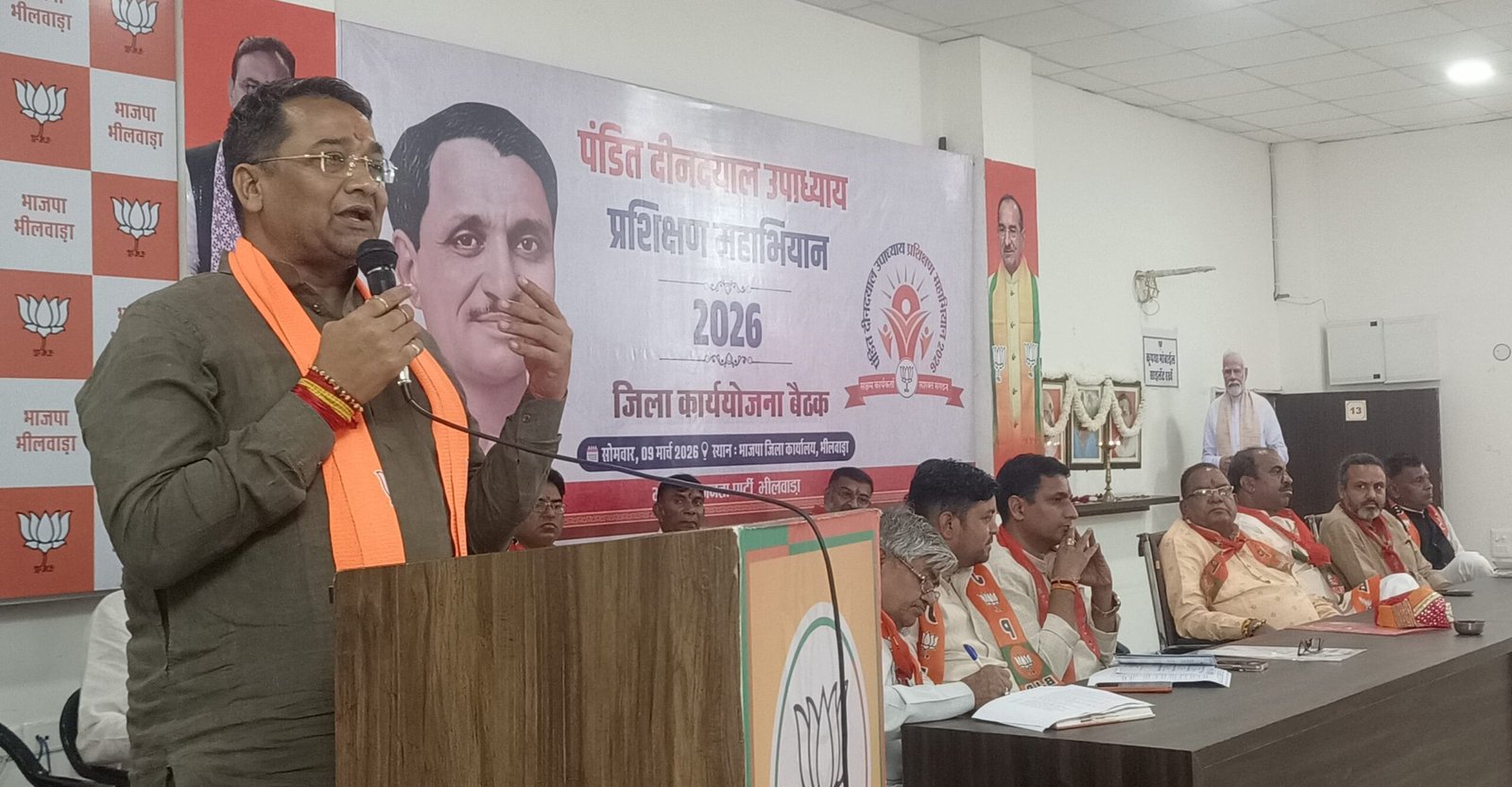 भीलवाड़ा 9 मार्च। भारतीय जनता पार्टी प्रदेश नेतृत्व के निर्देशानुसार भाजपा जिला संगठन द्वारा जिला कार्यालय पर पंडित दीनदयाल उपाध्याय प्रशिक्षण महाअभियान जिला कार्यशाला का आयोजन भाजपा प्रदेश उपाध्यक्ष छगन माहुर के मुख्य आतिथ्य, भाजपा जिलाध्यक्ष प्रशान्त मेवाड़ा की अध्यक्षता एवं प्रदेश कार्यसमिति सदस्य पूर्व मंत्री कालूलाल गुर्जर एवं पूर्व महापौर राकेश पाठक के सान्निध्य एवं अभियान जिला संयोजक जिला महामंत्री अविनाश जीनगर की उपस्थिति में किया गया।