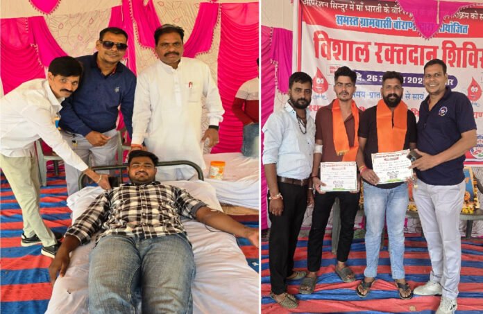 भीलवाडा।स्मार्ट हलचल|सहयोग सेवार्थ फाउंडेशन भीलवाड़ा के तत्वाधान में समस्त ग्रामवासी बोराणा के सहयोग से राजकीय उच्च माध्यमिक विद्यालय बोराणा मे आयोजित आपरेशन सिंदूर में भारतीय सेना के शौर्य को समर्पित रक्तदान शिविर में युवाओं में भारत माता एवं भारतीय सेना के नारे लगाते हूए उत्साह के साथ रक्तदान किया। शिविर में 102 युवाओं ने रक्तदान कर शहीदों को श्रद्धांजलि समर्पित की। शिविर संयोजक कैलाश चंद्र गाड़िया लौहार ने बताया कि शिविर का शुभारंभ जिला परिषद् सदस्य बलवीर सिंह, मण्डल अध्यक्ष मुकेश सोनी, पुष्कर राठौर, मंडल महामंत्री भरत वैष्णव, सत्यनारायण पाराशर, शक्ति केंद्र प्रमुख मिश्री लाल मेवाड़ा, समाज सेवी रोशन लाल खटीक ने भारत माता एवं महापुरुषों के पुष्पांजलि अर्पित कर किया। शिविर में रक्तदाता टीम बोराणा के मनीष रेगर हिमांशु रेगर दिव्यांश बोलीवाल श्रीयांश बोलीवाल अर्पित टेलर ने रक्तदान कर शिबिर को सफल बनाने में सहयोग किया। शिविर में महिला शक्ति लक्ष्मी देवी गाड़िया लोहार एवं लक्ष्मी देवी वैष्णव ने रक्तदान कर महिला रक्तदान के प्रति ग्रामीण महिलाओं को जागरूक किया। सहयोग सेवार्थ फाउंडेशन के सचिव गोपाल विजयवर्गीय ने बताया कि शिविर में सभी रक्तविरो को रक्तदाता सम्मान पत्र प्रदान कर सम्मानित किया गया। रक्त संग्रहण कोटड़ी श्याम ब्लड सेंटर द्वारा किया गया।