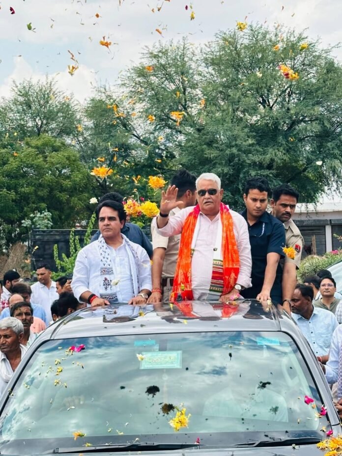 डॉक्टर किरोडी लाल मीणा का चांदी का मुकुट पहनाकर पुष्प वर्षा के साथ कलश यात्रा निकालकर ग्रामीणों ने किया भव्य स्वागत