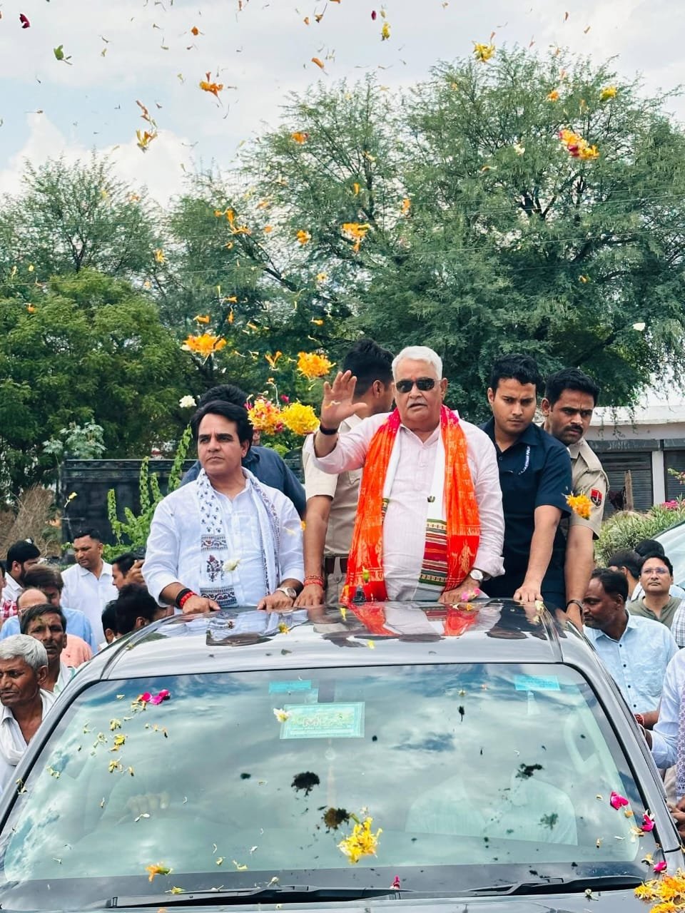 इस दौरान डॉक्टर किरोड़ी लाल मीणा ,महवा विधायक राजेंद्र मीणा का ग्रामीणों ने चांदी का मुकुट पहनाकर जेसीबी मशीनों से पुष्प वर्षा कर कलश यात्रा निकालकर गर्म जोशी के साथ भव्य स्वागत सत्कार किया