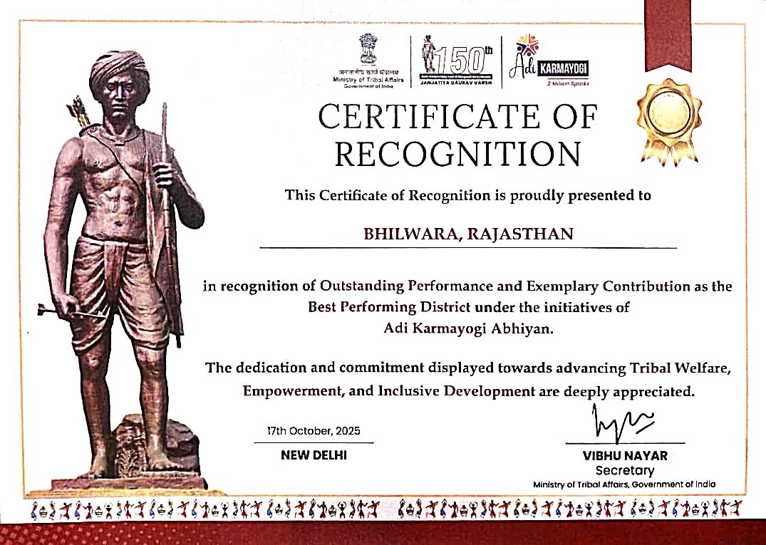 भीलवाड़ा जिले को आदिवासी कल्याण में उत्कृष्ट योगदान के लिए राष्ट्रीय स्तर पर किया गया सम्मानित