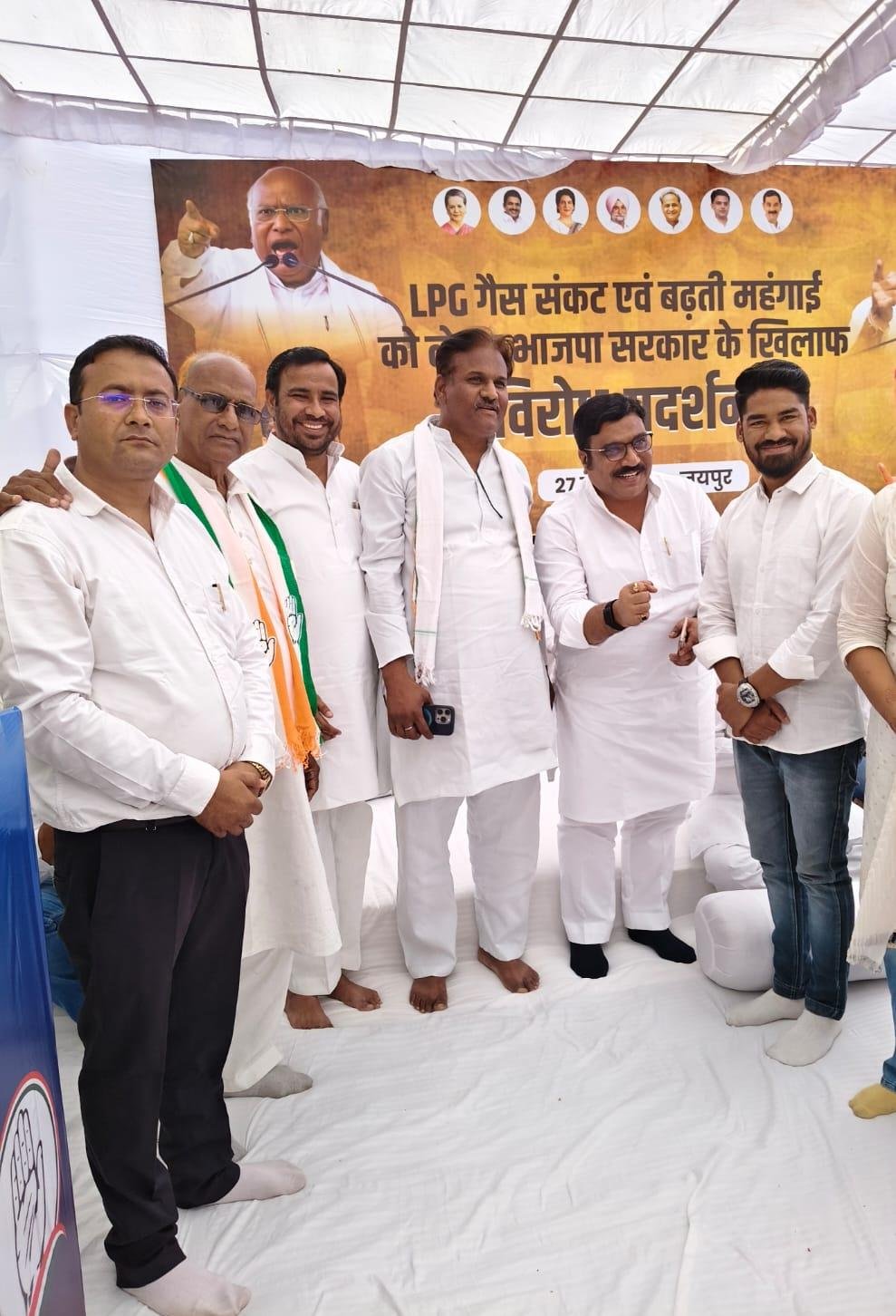 स्मार्ट हलचल|ब्यावर जयपुर राजस्थान प्रदेश कांग्रेस कमेटी अल्पसंख्यक विभाग द्वारा जयपुर के शहीद मार्ग पर बढ़ती महंगाई और गैस सिलेंडरों के बढ़ते दामों के खिलाफ विशाल धरना-प्रदर्शन किया गया। प्रदेश अध्यक्ष गोविंद सिंह डोटासरा के दिशा-निर्देशन और अल्पसंख्यक विभाग के प्रदेशाध्यक्ष एम.डी. चोपदार की अगुवाई में आयोजित इस प्रदर्शन में ब्यावर जिले से प्रदेश कॉर्डिनेटर ऋषि लाम्बा, प्रदेश सचिव शाकिर कुरैशी और मजीद कुरैशी ने प्रमुखता से भाग लिया।
