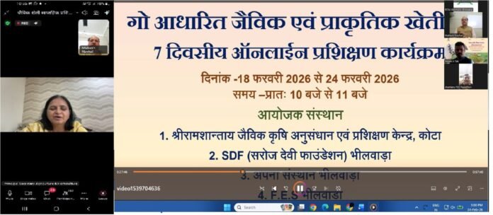 भीलवाड़ा। स्मार्ट हलचल,गो आधारित जैविक एवं प्राकृतिक खेती को बढ़ावा देने के उद्देश्य से सप्त दिवसीय प्रशिक्षण कार्यक्रम का आयोजन सरोज देवी फाउंडेशन के संरक्षक त्रिलोकचन्द छाबड़ा की पहल पर गोयल ग्रामीण विकास संस्थान श्रीरामशान्ताय जैविक कृषि अनुसंधान एवं प्रशिक्षण केंद्र, जाखोडा, कैथून, कोटा, सरोज देवी फाउंडेशन, भीलवाडा, अपना संस्थान, एवं एफईएस के संयुक्त तत्वावधान में सात 18 फरवरी 2026 से 24 फरवरी 2026 तक किया गया। प्रशिक्षण प्रतिदिन प्रातः 10 बजे से 11 बजे तक आयोजित हुआ। कार्यक्रम में श्रीरामशान्ताय जैविक कृषि अनुसंधान एवं प्रशिक्षण केंद्र, कोटा के मुख्य वैज्ञानिक पवन टांक द्वारा किसानों को गो आधारित जैविक एवं प्राकृतिक खेती की वैज्ञानिक एवं व्यावहारिक जानकारी दी गई। इन सभी सत्रों में त्रिलोक चंद छाबडा संरक्षक सरोज देवी फाउंडेशन का महत्वपूर्ण मार्गदर्शन रहा। समन्वयक महेश चन्द्र नवहाल ने बताया कि जैविक खेती की इस प्रशिक्षण में योजनाबद्ध तरीके से विषय निर्धारण कर प्रशिक्षण दिया गया द्य जिससे जैविक खेती के बारे में किसानो को जानकारी की पूर्णता का अनुभव हो। प्रशिक्षण के दौरान किसानों को चरणबद्ध तरीके से विभिन्न विषयों पर जानकारी दी गई। जिसमें कृषि में तकनीकी जानकारी का महत्व, जैविक खेती के लिये खेत चयन ताजा गोबर व गोमूत्र के उपयोग, बफर जोन एवं वृक्षारोपण,विविध वृक्ष प्रजाति के लाभ एवं सावधानियां तथा आवश्यक सुविधाओं के निर्माण एवं संकलन, मिट्टी एवं पानी की प्रयोगशाला जांच, प्रारंभिक दस्तावेजीकरण (फार्म बुक), जैविक प्रमाणीकरण, अवशेष प्रबंधन एवं साफ-सफाई तथा दीमक एवं सफेद मक्खी नियंत्रण, सरल खाद। निर्माण,सरल संजीवनी विधि से खेतों को ताकत देना, सावधानियां, फसल अनुसार मात्रा निर्धारण, हरी खाद (ढैंचा फसल) एवं गोमूत्र से सरल हाई पावर विधि की जानकारी दी गई। समापन प्रशिक्षण सत्र में कृषि विभाग, राजस्थान सरकार की प्रिंसिपल सेक्रेटरी (कृषि एवं उद्यानिकी) मंजू राजपाल ने जैविक एवं गो आधारित खेती को लेकर राज्य सरकार की योजनाओं एवं सफल प्रयासों की जानकारी साझा करते हुए किसानों से इसे अपनाने तथा अपने अपने क्षेत्र में बाकी किसानो को जोड़ने का आह्वान किया। इस सात दिवसीय प्रशिक्षण में कृषि विभाग की ओर से डिप्टी डायरेक्टर राजेन्द्र सिंह मनोहर, अजय कुमार पचोरी ने महत्वपूर्ण मार्गदर्शन दिया। समापन सत्र में श्रीरामशान्ताय जैविक कृषि अनुसंधान एवं प्रशिक्षण केंद्र, कोटा के संस्थापक ताराचंद गोयल ने जुड़े हुए किसानों को मास्टर ट्रेनर के रूप में जैविक खेती प्रशिक्षण को नीचे के स्तर पर ले जाने की आवश्यकता पर जोर दिया। ताराचंद गोयल ने कहा कि संस्थान की स्थापना ही इसलिए की गई है ताकि ग