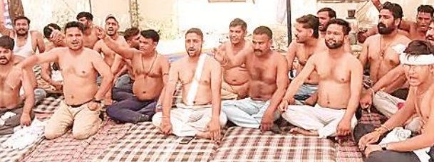 पर अर्धनग्न होकर विरोध जताया और पुलिस के खिलाफ नारेबाजी की। अपनी मांगें पूरी नहीं होने पर कार्यकर्ता सोमवार से अनिश्चितकालीन धरने पर बैठे हैं और उन्होंने रात भी