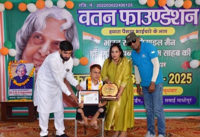 स्मार्ट हलचल|जिले के टॉपर छात्र-छात्राओं सहित विभिन्न क्षेत्रों की 40 से अधिक प्रतिभाओं को किया गया सम्मानित। सवाई माधोपुर। भारत रत्न मिसाइल मैन एवं पूर्व राष्ट्रपति डॉ. एपीजे अब्दुल कलाम की जयंती के अवसर पर बुधवार 15 अक्टूबर 25 को सवाई माधोपुर में “हमारा पैगाम भाईचारे के नाम” की थीम पर काम करने वाली वतन फाउंडेशन संस्था द्वारा “कलाम रत्न अवार्ड” सम्मान समारोह आयोजित किया गया।वतन फाउंडेशन के राष्ट्रीय प्रवक्ता मोइन खान ने जानकारी देते हुए बताया कि कार्यक्रम में जिले के विभिन्न सरकारी स्कूलों के प्रत्येक संकाय के ब्लॉक स्तर के कुल 25 टॉपर छात्र-छात्राओं और जिले में विभिन्न क्षेत्रों में उल्लेखनीय कार्य करने वाली 15 प्रतिभाओं को “कलाम रत्न अवार्ड” से सम्मानित किया गया साथ ही कार्यक्रम में पधारी देश के अलग अलग स्थानों पर उल्लेखनीय कार्य करने वाली हस्तियों को “कलाम गौरव अवार्ड” से सम्मानित किया गया। कार्यक्रम में मुख्य अतिथि के रूप में साबिर खान जादौन एंटर प्राइजेज मौजूद रहे जबकि कार्यक्रम की अध्यक्षता सामाजिक संगठन कल्याण संस्था नई दिल्ली की इंद्रजीत कौर ने की
