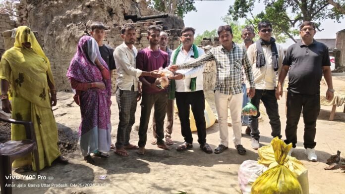 खखरेरू/स्मार्ट हलचल|फतेहपुर थाना क्षेत्र के बसवा गांव में 22 अप्रैल को चूल्हे से निकली चिंगारी से शीतला प्रसाद के घर में भीषण आग लग गई थी। आग की इस घटना में पीड़ित परिवार का पूरा घर तथा घर में रखी खाद्य सामग्री जलकर राख हो गई, जिससे परिवार के सामने भोजन तक का संकट खड़ा हो गया।घटना की जानकारी मिलने पर भारतीय किसान यूनियन (टिकैत गुट) के तहसील अध्यक्ष सर्वेश कुमार ने पीड़ित परिवार से मुलाकात कर राहत सामग्री प्रदान की। सहायता के रूप में 25 किलो आटा, 30 किलो गेहूं, 15 किलो चावल, 5 किलो दाल, 5 लीटर रिफाइंड तेल, 5 किलो चीनी, चाय पत्ती सहित आर्थिक सहयोग दिया गया।