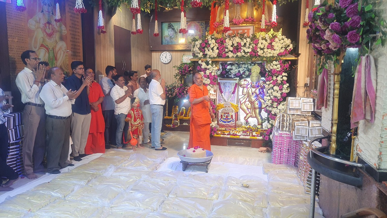 भीलवाड़ा, 2 अप्रेल। भगवान श्रीराम के अनन्य भक्त श्री हनुमानजी महाराज का जन्मोत्सव गुरूवार को शहर के मुख्य डाकघर के समीप स्थित श्री संकटमोचन हनुमान मंदिर में उत्साह एवं भक्ति भावना के साथ मनाया गया। हनुमान जन्मोत्सव पर सुबह हनुमानजी महाराज की प्रतिमा को स्वर्ण चोला चढ़ाया गया। दोपहर 12.15 बजे हनुमानजी की महाआरती में शामिल होने के लिए श्रद्धालु उमड़े पड़े। महाआरती मंदिर के महन्त बाबूगिरीजी महाराज ने की। महाआरती के बाद हनुमानजी महाराज को 1100 किलो केसरयुक्त काजूकतली का महाभोग लगाया गया। भक्तिपूर्ण माहौल में बाल हनुमान का रूप धरे बालक के हाथों 11 किलो का केक भी कटवा कर हनुमान जन्मोत्सव की खुशियां मनाई गई। महाभोग एवं केक काटने के दौरान जयश्री राम एवं हनुमानजी महाराज के जयकारे गूंजायमान होते रहे। महाआरती शुरू होने से पहले ही मंदिर में हनुमानजी महाराज के दर्शनों के लिए भक्ति एवं आस्था से ओतप्रोत श्रद्धालुओं की भीड़ उमड़ पड़ी थी। महाआरती एवं महाभोग के बाद काजूकतली का प्रसाद भक्तों में वितरित करना शुरू हुआ तो प्रसाद पाने के लिए श्रद्धालुओं की लंबी कतारे लग गई। किसी भी श्रद्धालु को प्रसाद पाने में परेशानी नहीं आए इसके लिए कई कार्यकर्ताओं को प्रसाद वितरण के कार्य में लगाया गया। हनुमान जयंति महोत्सव के अवसर पर मंदिर पर मनमोहक फूलों से विशेष सजावट के साथ भव्य रोशनी की गई।