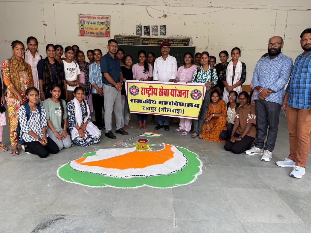 रायपुर 5 अगस्त राजकीय महाविद्यालय रायपुर, भीलवाड़ा में “हर घर तिरंगा” अभियान के अंतर्गत राष्ट्रीय सेवा योजना की इकाई द्वारा रंगोली प्रतियोगिता का आयोजन किया गया। इस प्रतियोगिता में महाविद्यालय के छात्र-छात्राओं ने उत्साहपूर्वक भाग लिया और रंगों के माध्यम से देशभक्ति की भावना को सजीव रूप दिया। रंगोली प्रतियोगिता में पलक एवं उनकी टीम ने उत्कृष्ट प्रस्तुति देकर प्रथम स्थान प्राप्त किया। सभी प्रतिभागियों द्वारा बनाई गई रंगोलियां राष्ट्रीय प्रतीकों, तिरंगे एवं भारत माता के प्रतीकों को समर्पित थीं, जो दर्शकों के लिए अत्यंत प्रेरणादायक रहीं।