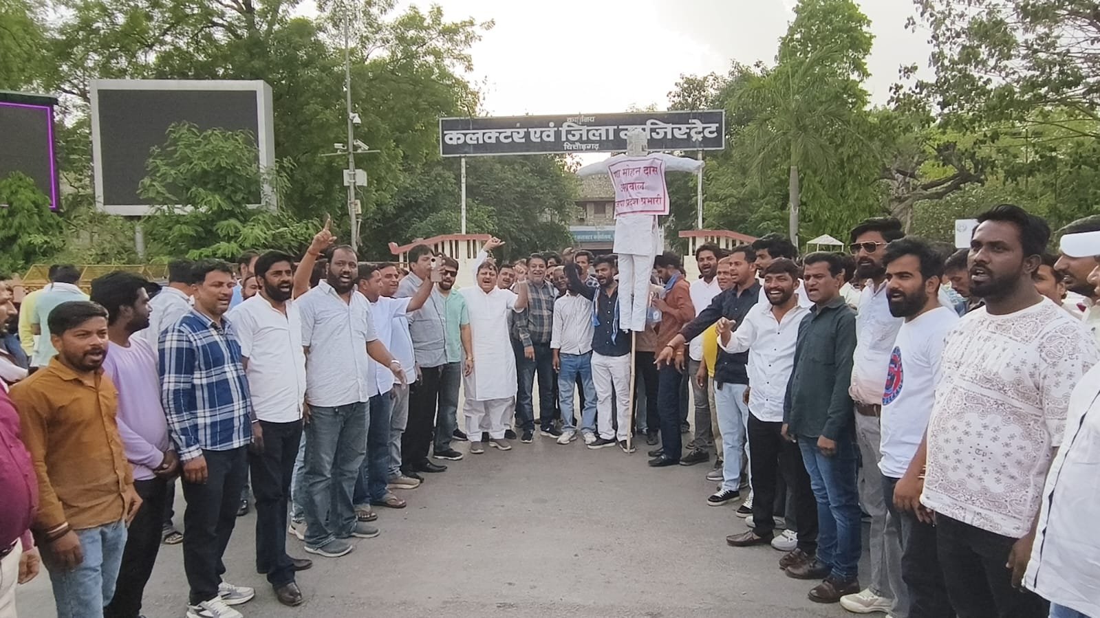 शंभूपुरा।स्मार्ट हलचल|चित्तौड़गढ़ नगर परिषद के निवर्तमान सभापति संदीप शर्मा के नेतृत्व में कांग्रेस जनों द्वारा अखिल भारतीय कांग्रेस कमेटी के महासचिव एवं राजस्थान के पूर्व उपमुख्यमंत्री सचिन पायलट के खिलाफ अमर्यादित बयान बाजी को लेकर भारतीय जनता पार्टी के राजस्थान प्रभारी राधा मोहन दास अग्रवाल का कलेक्ट्रेट पर पुतला फूंक कर उनके खिलाफ विरोध प्रदर्शन किया।