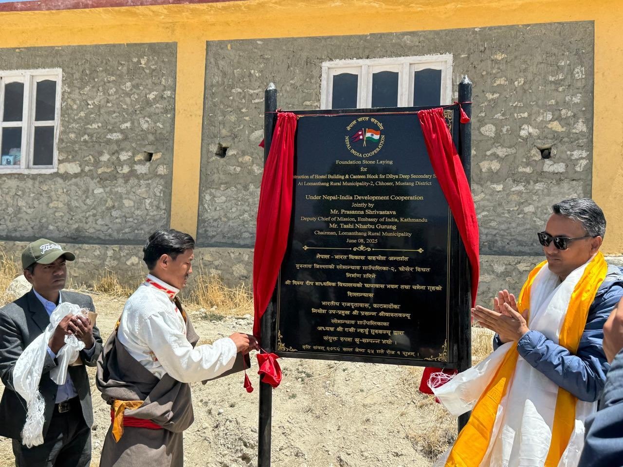 काठमांडू।स्मार्ट हलचल|नेपाल में मस्तंग जिले के लोमंथांग ग्रामीण नगर पालिका में रविवार को श्री दिव्य दीप माध्यमिक विद्यालय में नए छात्रावास भवन और कैंटीन ब्लॉक की आधारशिला रखी गई, जिसका निर्माण भारत की वित्तीय सहायता से किया जा रहा है। भारतीय दूतावास द्वारा जारी एक बयान के अनुसार, काठमांडू स्थित भारतीय दूतावास में मिशन के उप प्रमुख प्रसन्ना श्रीवास्तव और लोमंथांग ग्रामीण नगर पालिका के अध्यक्ष तासी न्हार्बू गुरुंग ने संयुक्त रूप से आधारशिला रखी।