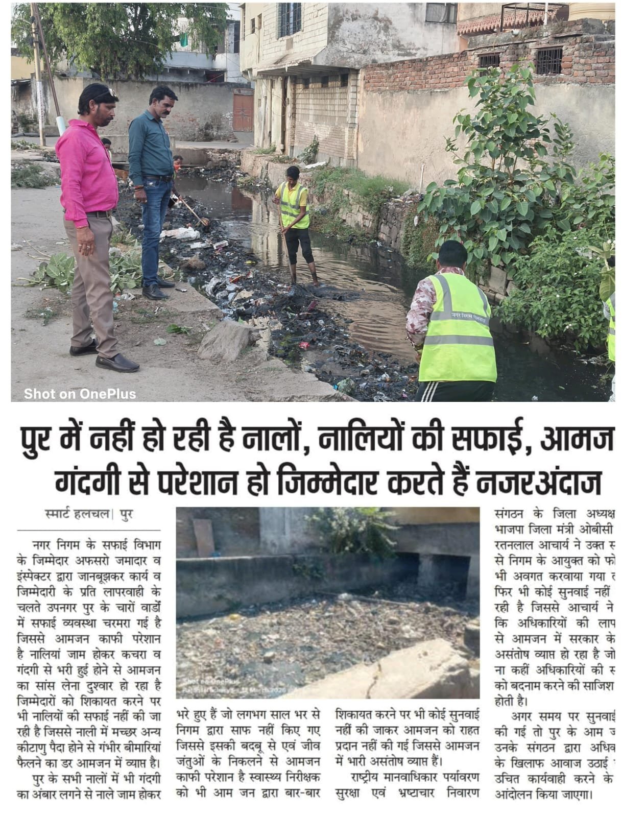 पुर । उपनगर पुर के चारों वार्डों में नालो व नालियों की सफाई नहीं होने से कीचड़ भरा होने से कीटाणु उत्पन्न होने से आम जन में गंभीर बीमारियों के फैलने के डर के चलते आमजन द्वारा राष्ट्रीय मानवाधिकार पर्यावरण सुरक्षा एवं भ्रष्टाचार निवारण संगठन के जिला अध्यक्ष व भाजपा ओबीसी मोर्चा जिला मंत्री रतनलाल आचार्य को अपनी पीड़ा जाहिर की गई जिस पर आचार्य ने आवाज उठाते हुए निगम के जिम्मेदार अधिकारियों व आयुक्त को सूचित करने के उपरांत भी कार्यवाही नहीं होने के कारण स्मार्ट हलचल न्यूज द्वारा आवाज उठाई । जिस पर निगम के अधिकारियों ने अपनी नींद तोड़ते हुए नालियों की सफाई कर कीचड़ बाहर निकल गया।