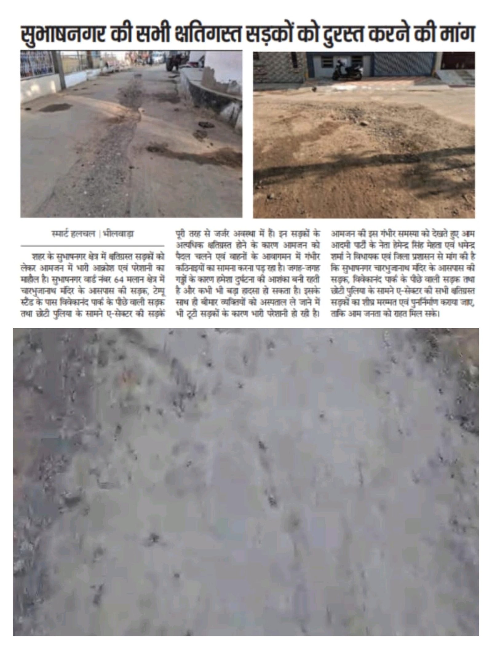 भीलवाड़ा। सुभाषनगर वार्ड 64 में चंबल जल योजना के कार्य के दौरान कई स्थानों पर सड़कें क्षतिग्रस्त हो गई थीं, जिससे क्षेत्र के लोगों को आवागमन में भारी परेशानी का सामना करना पड़ रहा था। इस समस्या को गंभीरता से लेते हुए आम आदमी पार्टी के नेता हेमेन्द्र सिंह मेहता ने स्मार्ट हलचल न्यूज के माध्यम से सुभाषनगर क्षेत्र की क्षतिग्रस्त सड़कों को शीघ्र ठीक करवाने की मांग पार्षद एवं प्रशासन से की थी। इस मांग पर त्वरित संज्ञान लेते हुए पार्षद एवं प्रशासन द्वारा सुभाषनगर वार्ड 64 में क्षतिग्रस्त सड़कों की मरम्मत का कार्य प्रारंभ करवा दिया गया। सड़क मरम्मत कार्य शुरू होने से क्षेत्रवासियों में खुशी का माहौल है और उन्होंने राहत महसूस की है। आम आदमी पार्टी ने कहा कि पार्टी हमेशा जनता की समस्याओं के समाधान के लिए प्रतिबद्ध है और आगे भी क्षेत्र के विकास तथा जनहित से जुड़े मुद्दों को मजबूती से उठाती रहेगी।