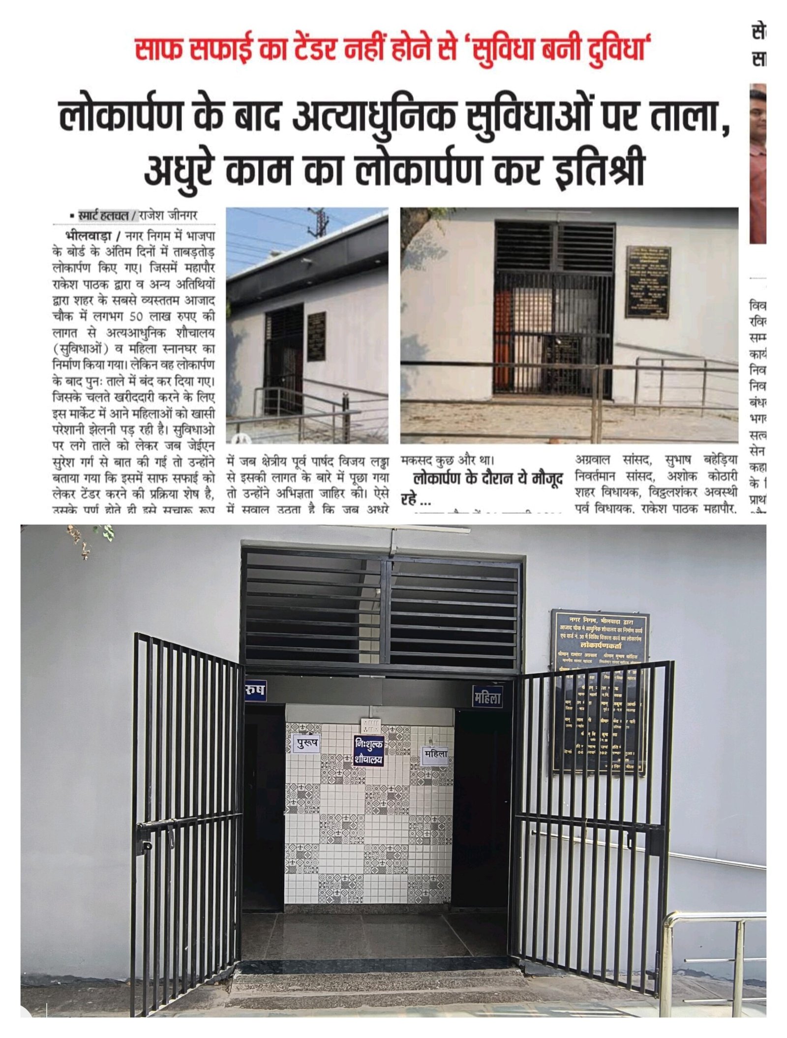 भीलवाड़ा । 23 फरवरी को स्मार्ट हलचल में “सुविधा बनी दुविधा” शिर्षक नाम से प्रकाशित खबर का हुआ बड़ा असर, ज्ञात रहे की लगभग 50 लाख की लागत से बने अत्याधुनिक सुविधाओं पर लोकार्पण के बाद ताले की समस्या को स्मार्ट हलचल ने प्रमुखता से उठाया था। जिसको नगर निगम के जिम्मेदारों ने गंभीरता से लेते हुए बंद ताले को खोलकर इसको शुरू कर दिया गया।