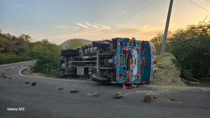 बनेड़ा – जयपुर काकरोली स्टेट हाइवे न 12 पर भीलवाड़ा मार्ग पर गुरुवार रात्री जोगियो के बाग स्थित विकट मोड़ पर खाखले से भरा ट्रक पलट गया। जिसके कारण पास मे लगे एक विधुत पोल के तार टूट गए। जिसके कारण मानपुरा और इन्दिरा कोलोनी क्षेत्र की विधुत आपुर्ति पुरी रात ठप्प रही। प्राप्त जानकारी के अनुसार भीलवाड़ा मार्ग पर 12 मार्च की रात्रि के करीब 10 बजे खाखले से भरा एक ट्रक भीलवाड़ा की और जा रहा था। विकट मोड़ पर ट्रक असतुलित होकर के पलट गया। पलटे ट्रक के कारण पास मे लगे विधुत पोल के तार टूट जाने के कारण मानपुरा और इन्दिरा कोलोनी की विधुत आपुर्ति ठप्प हो गई ।जिसके चलते दोनों बस्तियों के लोगों को पुरी अंधेरे में गुजारने को मजबूर होना पड़ा। रात्रि में ठप्प विधुत आपुर्ति शुक्रवार दोपहर सुचारू हुई।