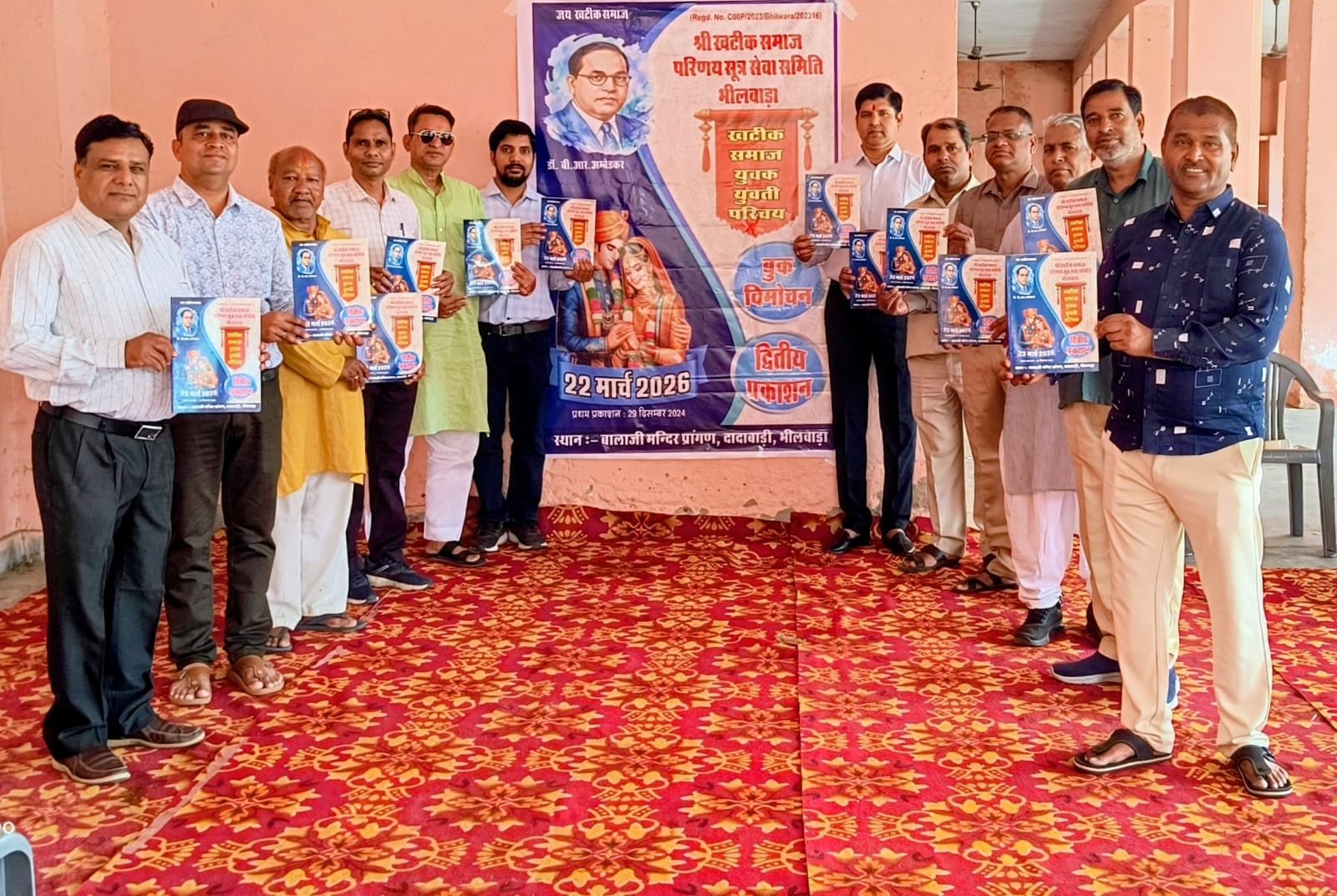 भीलवाड़ा । श्री खटीक समाज परिणय सूत्र सेवा समिति, भीलवाड़ा के तत्वावधान में दादाबाड़ी स्थित बालाजी मन्दिर प्रांगण में समाज के 976 युवक-युवती परिचय पुस्तिका का विमोचन कार्यक्रम का गरिमामय आयोजन किया गया। कार्यक्रम की शुरुआत संविधान निर्माता डॉ. बी.आर. अम्बेडकर के चित्र पर माल्यार्पण कर की गई। इस अवसर पर संस्था के द्वितीय प्रकाशन (परिचय पुस्तिका) का विमोचन किया गया। प्रथम प्रकाशन 29 दिसंबर 2024 को किया गया था जिसमें लगभग 500 युवक युवतियों का परिचय था। संस्था के मुख्य सदस्य अमृतलाल खोईवाल ने बताया कि यह पुस्तिका खटीक समाज के वैवाहिक संबंधों को सुलभ बनाने पारिवारिक मेल-मिलाप और रिश्तों को तय करने में सुगमता की दिशा में एक महत्वपूर्ण कदम है। कार्यक्रम में संस्था के प्रमुख पदाधिकारी एवं समाज के गणमान्य जन उपस्थित रहे जिसमें रामप्रसाद सुहिल, मिश्रीलाल खोईवाल, मोहन अमरिया, मुकेश पहाड़िया, अमृतलाल खोईवाल, शैलेन्द्र डिडवानिया, सुरेश चंदेरिया, कैलाश पटेल, प्रेमलाल बड़गुजर, विनोद पटेल, विनोद खोईवाल, नंदकिशोर चावला, किशन खोईवाल आदि उपस्थित थे।