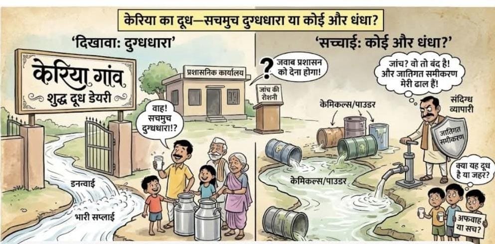 क्षेत्रवासियों ने खाद्य सुरक्षा विभाग और प्रशासन से मांग की है कि केरिया गांव में चल रही दूध और पनीर की सप्लाई की तत्काल सैंपलिंग कर जांच कराई जाए। ताकि दूध की गुणवत्ता और इसकी वास्तविकता सामने आ सके।अब सवाल यह है कि केरिया गांव में बह रही यह “दूधधारा” वास्तव में शुद्धता का प्रतीक है या फिर मिलावट के किसी बड़े खेल की परतें छिपी हुई हैं। इसका जवाब अब प्रशासन और जांच एजेंसियों सहित जिम्मेदारों को ही देना होगा।