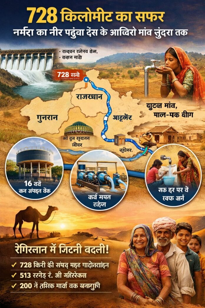सरदार सरोवर बांध से शुरू होकर नर्मदा का पानी 728 किलोमीटर की दूरी तय कर सुंदरा तक पहुंचा। करीब 513 करोड़ रुपए की इस योजना के तहत 200 से अधिक गाँवों तक पानी पहुंचाने का लक्ष्य रखा गया।
