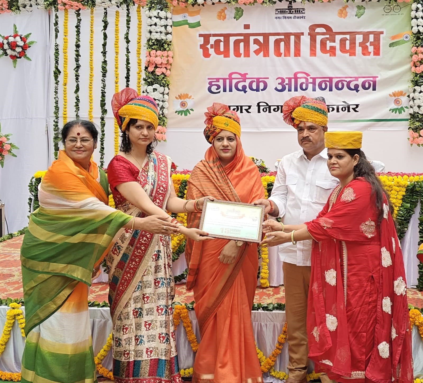 जयपुर :स्मार्ट हलचल/78वें स्वतंत्रता दिवस के अवसर पर बीकानेर नगर निगम द्वारा विभिन्न श्रेणियों में विभूतियों का जिला स्तर पर सम्मान किया गया। शिक्षा व साहित्य की श्रेणी में उल्लेखनीय कार्यों के लिए शिक्षाविद् एवं साहित्यकार डॉ.कांता मीना का नगर निगम आयुक्त आरएएस अर्पिता सोनी,महापौर सुशीला कंवर राजपुरोहित,उप महापौर राजेंद्र पंवार व पार्षद सुमन छाजेड़ द्वारा साफा पहनाकर व प्रशस्ति पत्र प्रदान करके जिला स्तर पर सम्मानित किया गया । डॉ.मीना 77वें स्वतंत्रता दिवस पर नगर निगम सहित अनेक सामाजिक संस्थाओ से सम्मानित हो चुकी है व इनका लेखन कार्य अनवरत जारी है।