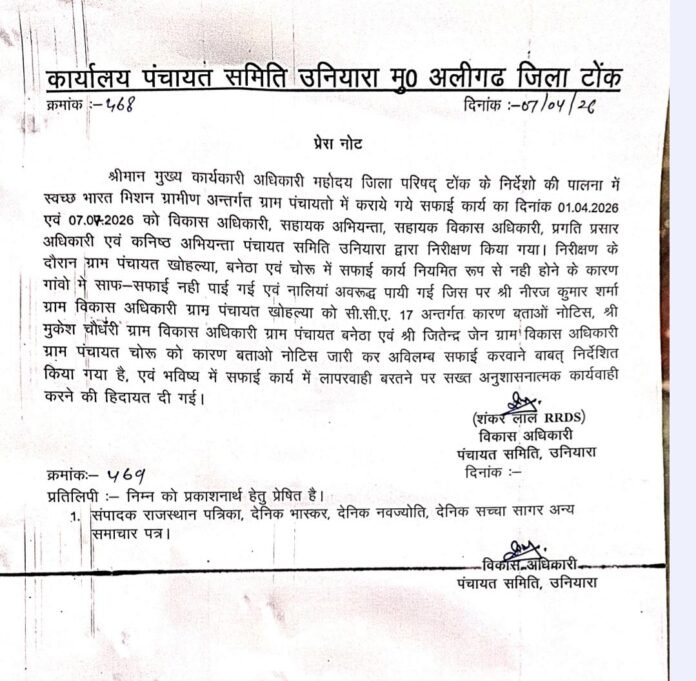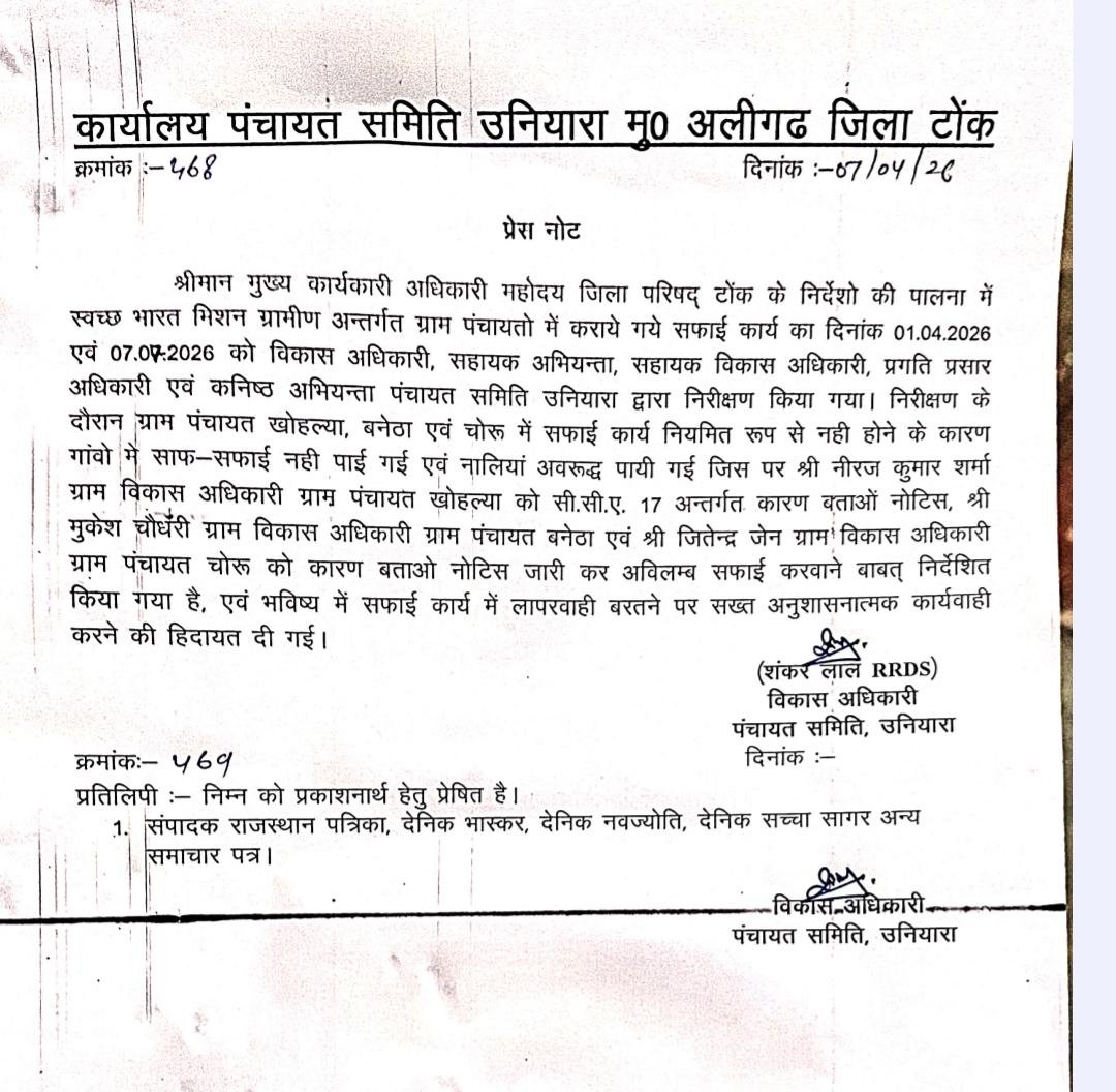 कार्यालय पंचायत समिति उनियारा के खण्ड विकास अधिकारी शंकरलाल मेघवाल द्वारा जारी प्रेसनोट के अनुसार 1 अप्रैल 2026 से 7 अप्रैल के बीच 7 दिन तक चलाए गए जांच अभियान में मन खण्ड विकास अधिकारी, सहायक अभियंता, सहायक विकास अधिकारी एवं प्रगति प्रसार अधिकारियों की संयुक्त टीम ने विभिन्न ग्राम पंचायतों का निरीक्षण किया। निरीक्षण के दौरान कई ग्राम पंचायतों के गांवों में नियमित सफाई नहीं होने, नालियों के अवरुद्ध होने और जगह-जगह गंदगी पाए जाने के मामले सामने आए। स्थिति को गंभीर मानते हुए तीन ग्राम पंचायतों के ग्राम विकास अधिकारियों को नोटिस जारी कर जवाब मांगा गया है। संबंधित अधिकारियों को स्पष्ट निर्देश दिए गए हैं कि वे तुरंत सफाई व्यवस्था दुरुस्त करें, अन्यथा उनके खिलाफ सख्त अनुशासनात्मक कार्रवाई की जाएगी। खण्ड विकास अधिकारी ने अपने आदेश में यह भी कहा है कि भविष्य में इस तरह की लापरवाही बर्दाश्त नहीं की जाएगी और नियमित मॉनिटरिंग जारी रहेगी।