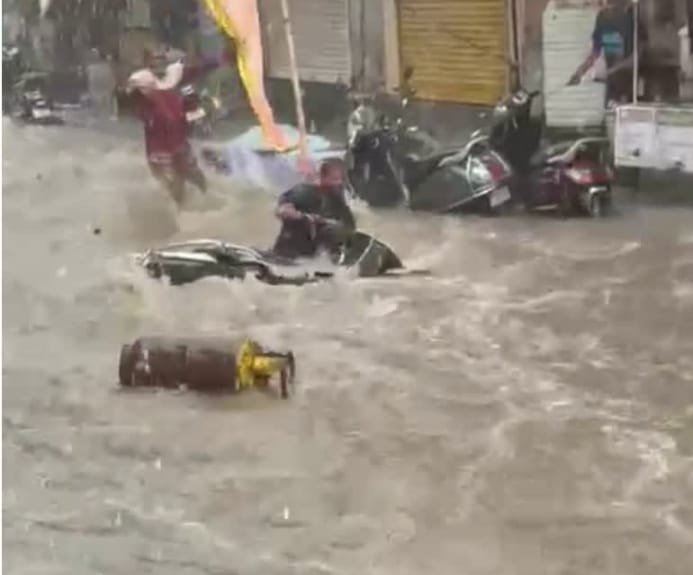 बूंदी: स्मार्ट हलचल|सोमवार को अचानक हुई एक घंटे की मूसलाधार बारिश ने बूंदी शहर के लिए आफत बन गई. पुराने शहर की तंग गलियों और बाजारों में पानी ऐसे उफान पर आया, मानो नदी बह रही हो. महज चंद मिनटों में सड़कें दरिया बन गईं. सदर बाजार, तिलक चौक, मीरा गेट, ठठेरा बाजार जैसे इलाकों में हालात बेकाबू हो गए. तेज बारिश से पहाड़ों से उतरकर आया पानी बाजार की गलियों से होकर दौड़ पड़ा. सदर बाजार में दुकानों के बाहर रखा सामान पानी के साथ बह गया. वहीं, कई वाहन पानी के तेज बहाव में सड़क से खिसकते हुए बहे. लोगों ने अपनी गाड़ियों को बचाने के लिए रस्सियों से बांधने की जुगत लगाई, लेकिन कई जगह उनकी कोशिशें नाकाम साबित हुईं.