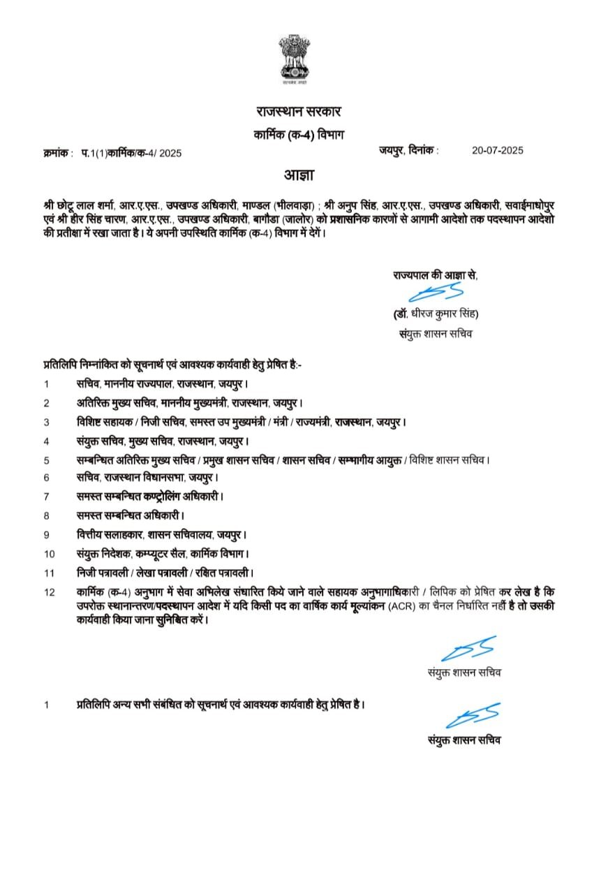 भीलवाड़ा । एसडीएम थप्पड़कांड मामले में कुछ न कुछ नया देखने को मिल रहा है और यह लोगो में काफी चर्चा का विषय भी बना हुआ है इस बीच आरोप प्रत्यारोप का दौर भी चल रहा है । वही अब इस मामले से जोड़कर मांडल के तत्कालीन और प्रतापगढ़ के वर्तमान उपखंड अधिकारी छोटू लाल शर्मा का सोशल मीडिया पर पुराना एपीओ लेटर वायरल हुआ है जिसमे एसडीएम शर्मा को सस्पेंड कर दिया गया बताया गया है । जबकी इस तरह की कोई भी आधिकारिक पुष्टि नही हुई है न कोई आदेश जारी हुए है । जो लेटर वायरल हुआ है वह पुराना है जब एसडीएम मांडल में पदस्थापित थे और यह ऑर्डर 20 जुलाई 2025 का है । इस पुराने ऑर्डर के वायरल होने से पसोपेश की स्थिति बन गई और खुद आला अधिकारी भी इस ऑर्डर के वायरल होने से हैरान और परेशान हो गए है ।