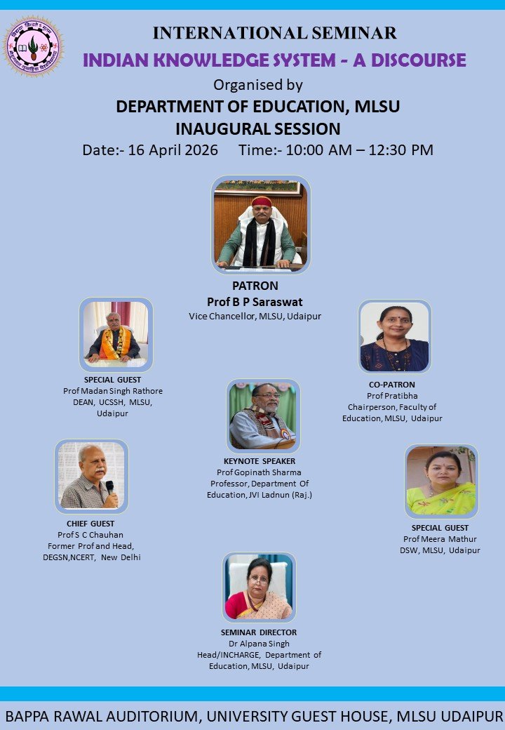उदयपुर।स्मार्ट हलचल|मोहनलाल सुखाड़िया विश्वविद्यालय के शिक्षा संकाय द्वारा 16 एवं 17 अप्रैल को दो दिवसीय अंतरराष्ट्रीय सेमिनार का आयोजन किया जा रहा है। सेमिनार का शुभारंभ 16 अप्रैल को प्रातः 10:00 बजे बप्पा रावल गोल्डन जुबली गेस्ट हाउस में होगा।कार्यक्रम के मुख्य अतिथि कुलगुरु प्रो. बी.पी. सारस्वत रहेंगे। इस अवसर पर विशिष्ट अतिथियों के रूप में प्रो. गोपीनाथ शर्मा (डिपार्टमेंट ऑफ एजुकेशन, जैन विश्व भारती इंस्टीट्यूट), प्रो. एस.सी. चौहान (प्रमुख, डी.ई.जी.एस.एन., एनसीईआरटी), प्रो. मदन सिंह राठौड़ (अधिष्ठाता, सामाजिक एवं मानविकी महाविद्यालय, एमएलएसयू), प्रो. मीरा माथुर (निदेशक एवं अधिष्ठाता, एफएमएस), प्रो. प्रतिभा पांडे (अध्यक्ष, शिक्षा संकाय) तथा डॉ. अल्पना सिंह (विभाग प्रमुख, शिक्षा संकाय) उपस्थित रहेंगे।