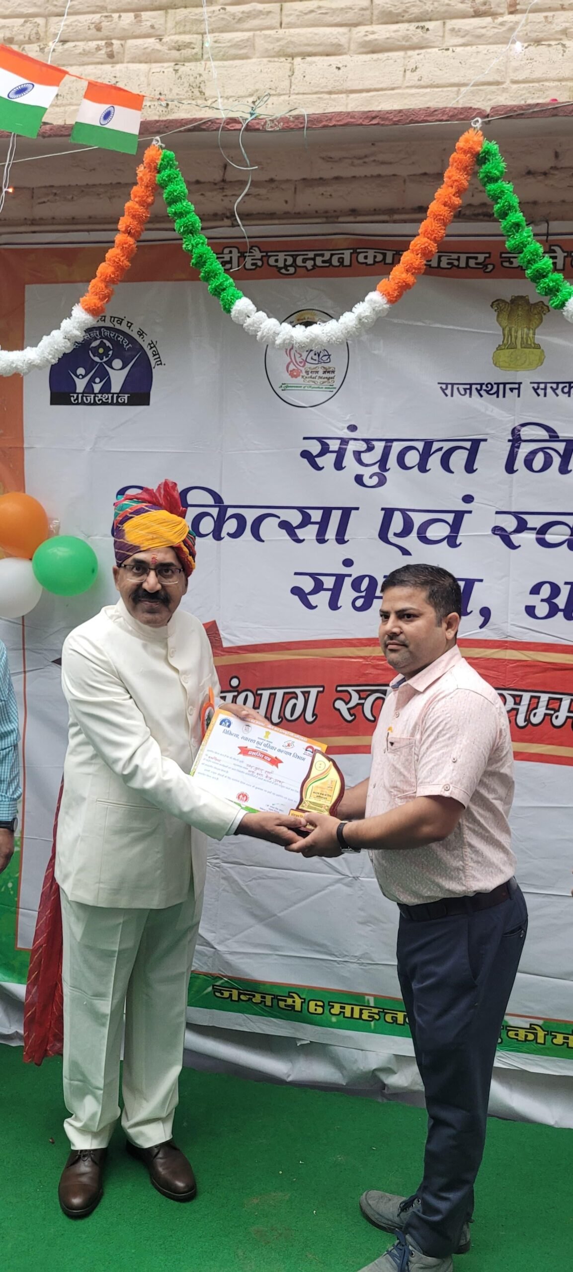 पुष्कर/स्मार्ट हलचल/अजमेर तीर्थराज पुष्कर में राजकीय सामुदायिक स्वास्थ्य केन्द्र पर फार्मासिस्ट कार्यरत पवन कुमार शर्मा को संभाग स्तर पर स्वतंत्रता दिवस पर सम्मानित किया गया ।