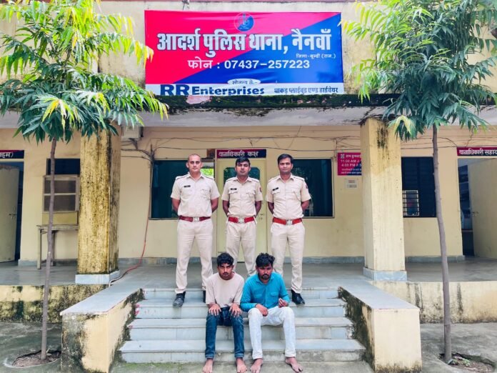 जिला पुलिस अधीक्षक बून्दी द्वारा चोरी, लूट, नकबजनी, की वारदातो पर प्रभावी अंकुश लगाते हुए अपराधियो की त्वरित गिरफ्तारी कर चोरिना माल की शत प्रतिशत रिकवरी के निर्देश दिये गये थे। उक्त निर्देशो की पालना में उमा शर्मा अतिरिक्त पुलिस अधीक्षक बून्दी के मार्गदर्शन मे एवं राजूलाल मीणा वृताधिकारी वृत नैनवां के सुपरविजन में कमलेश शर्मा पु.नि. थानाधिकारी पुलिस थाना नैनवां के नेतृत्व में पुलिस टीम का गठन किया गया । पुलिस टीम द्वारा घटनास्थल का मोका मुआयना किया गया व घटनास्थल से तकनीकी साक्ष्य जुटाये जिससे मुल्जिमान को चिन्हित किया जाकर मुल्जिमान 1-अमीन पुत्र दोलत उम्र 18 साल 2 माह निवासी नगर रोड नैनंवा 2- सरबीत पुत्र सलीम उम्र 32 साल निवासी कच्ची बस्ती निवाई थाना सदर निवाई जिला टोक को गिरफ्तार कर चोरी की गई 03 बकरियो को बरामद किया गया तथा वारदात मे प्रयुक्त एक होण्डा सिटी कार को जप्त किया गया । आरोपी नशे के आदी है और नशे का शोक पुरा करने क लिये चोरी करते थे। प्रकरण में अग्रिम अनुसंधान जारी है।