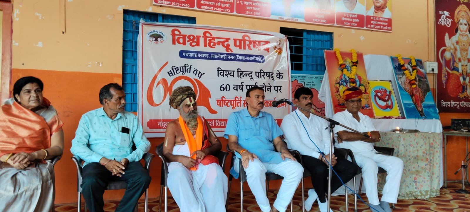स्मार्ट हलचल /भवानी मंडी विश्व हिंदू परिषद को 60 वर्ष पूर्ण होने पर भवानी मंडी नगर व पचपहाड़ प्रखंड का षष्टी पूर्ति कार्यक्रम संपन्न हुआ।विश्व हिंदू परिषद के जिला मंत्री नंदकिशोर खेर ने बताया की कार्यक्रम के तहत कालवा स्थान से नन्दू बाई शंकर लाल आदर्श विद्या मन्दिर रामनगर तक जुलूस के रूप में दो पहिया वाहन की रैली रही जिसमें सैकड़ो लोगों ने भाग लिया। षष्टीपूर्ति कार्यक्रम नंदू भाई शंकर लाल आदर्श विद्या मंदिर रामनगर में समापन के रूप में प्रारंभ हुआ जिसमें मुख्य वक्ता के रूप में युधिष्ठिर सिंह हाडा प्रांतीय सह मंत्री चित्तौड़ प्रांत, विशिष्ट तिथि मोहन मालव एडवोकेट प्रांतीय विशेष संपर्क प्रमुख चित्तौड़ प्रांत, कार्यक्रम में संत आशीर्वाद हेतु श्री बालक दास महाराज जी कलवा स्थान, मातृशक्ति के रूप में कामाक्षी गुप्ता, बाराँ विभाग संयोजिका मातृशक्ति,